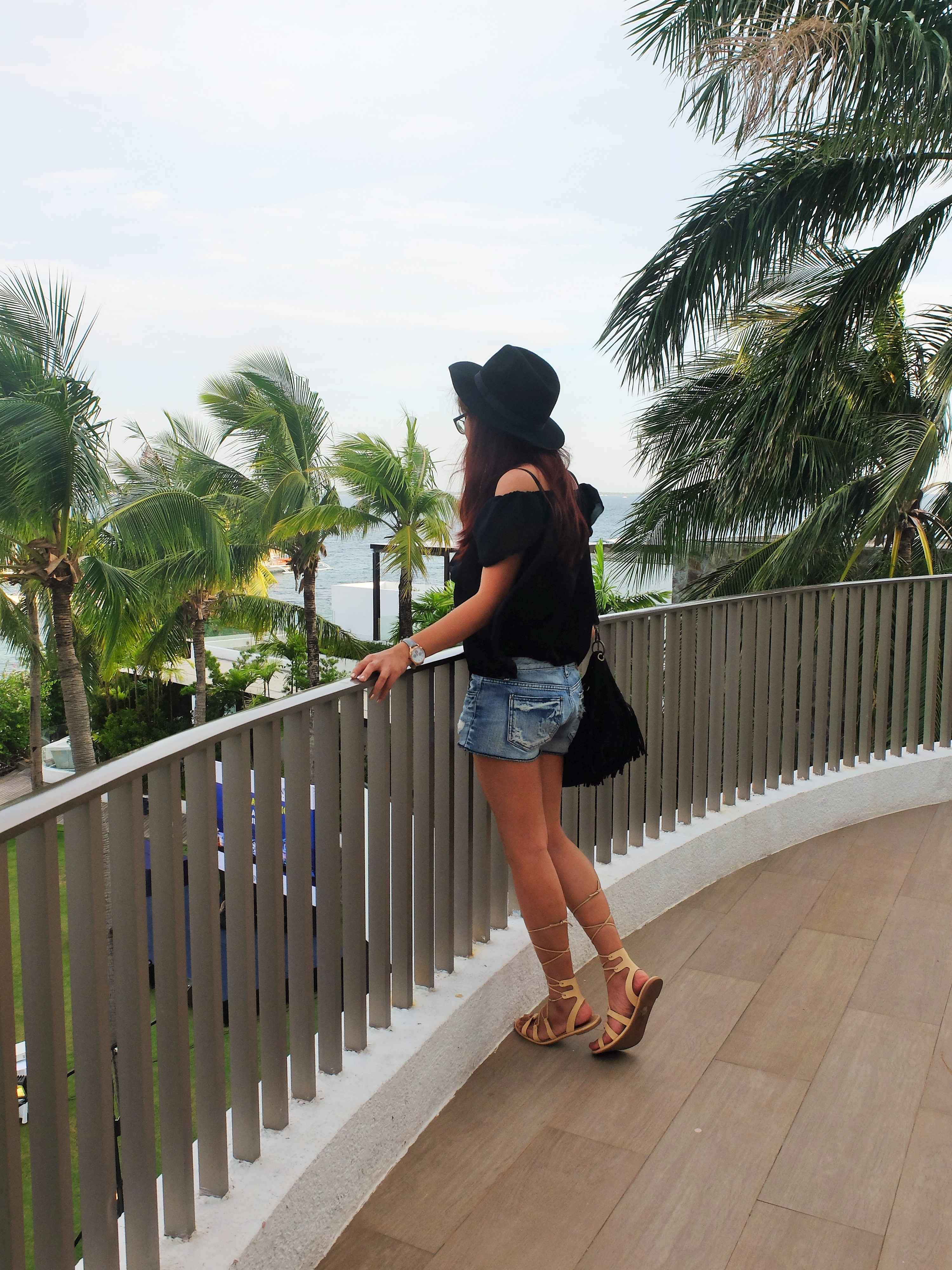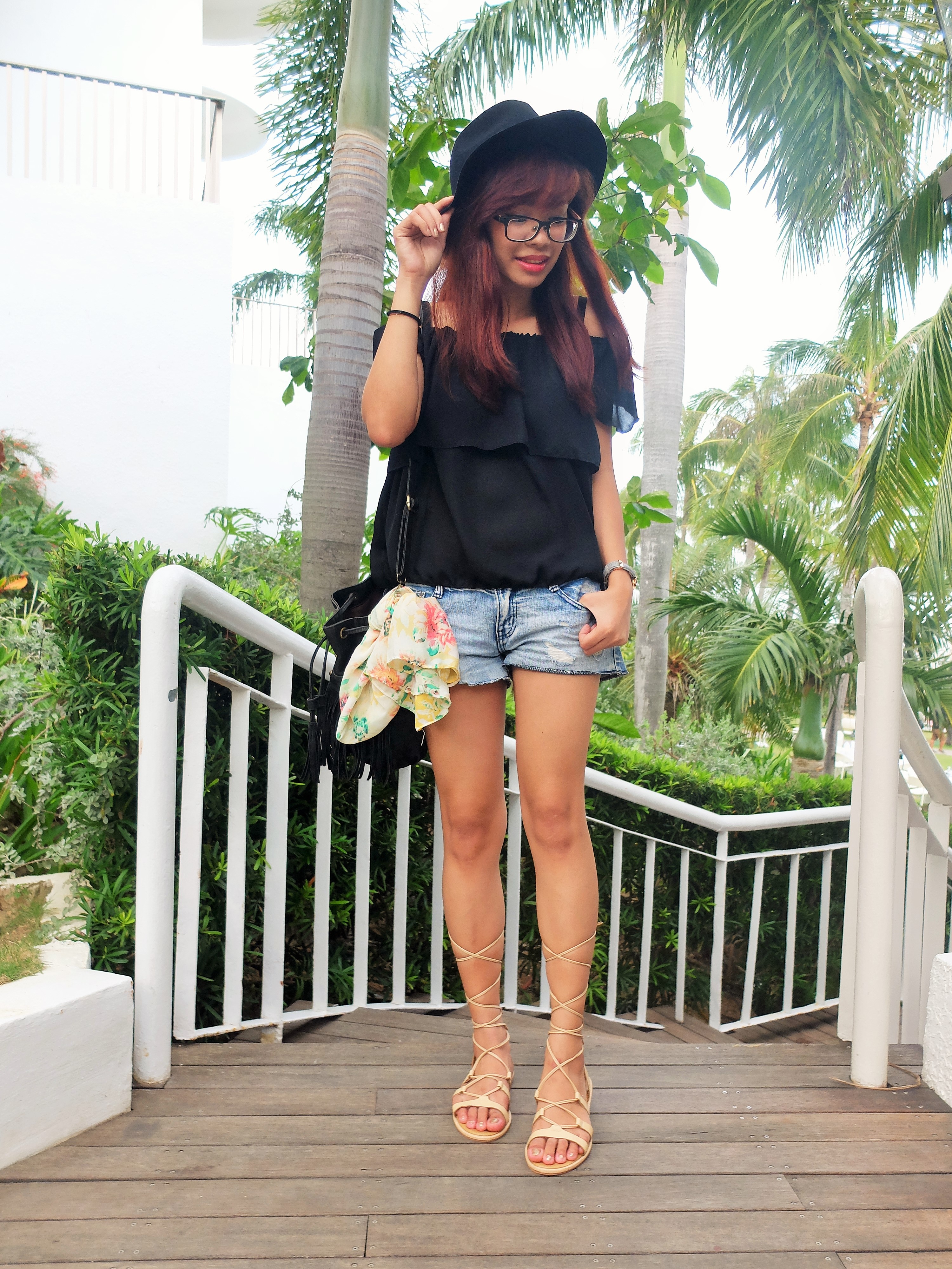 Showing you what I wore last month when we had our #BankOnBasic shoot for GiordanoPH (which I will be sharing to you on my next post) at Mövenpick Hotel, just a few minutes away from the city. I went for a comfortable and easy-to-go-around look with a black off shoulder top, shorts, black Fedora hat, fringe bag and a lace up sandals to finish my look.