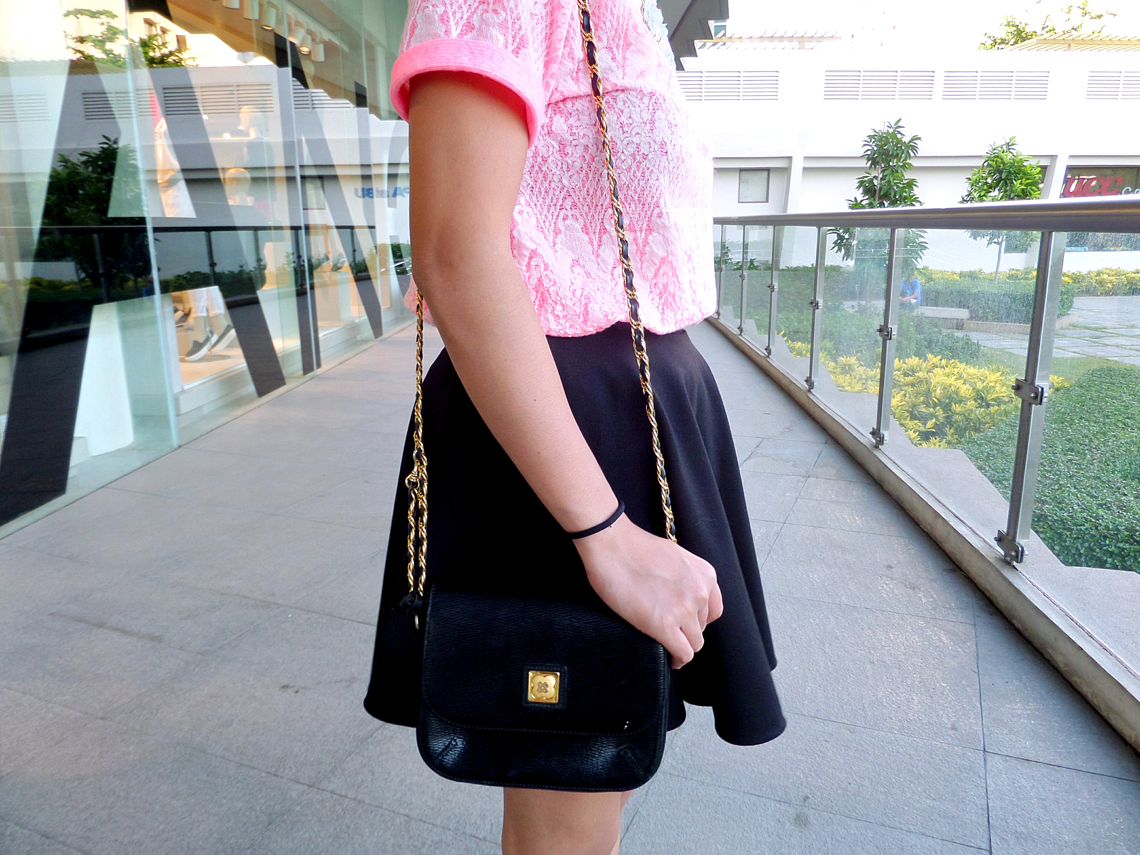 If you remembered last summer (with my long red locks), I was invited to the grand launch of EA Party Place and Needs (which I blogged about here) and this is what I wore during the event. I wanted to be in theme by sporting this cute pink shirt I scored at the thrift store and paired it with a black skater skirt to tone down the neon pink top. Black Sling bag, a statement necklace and a pony tail hairstyle to finish up my look that day. Tell me what you think!