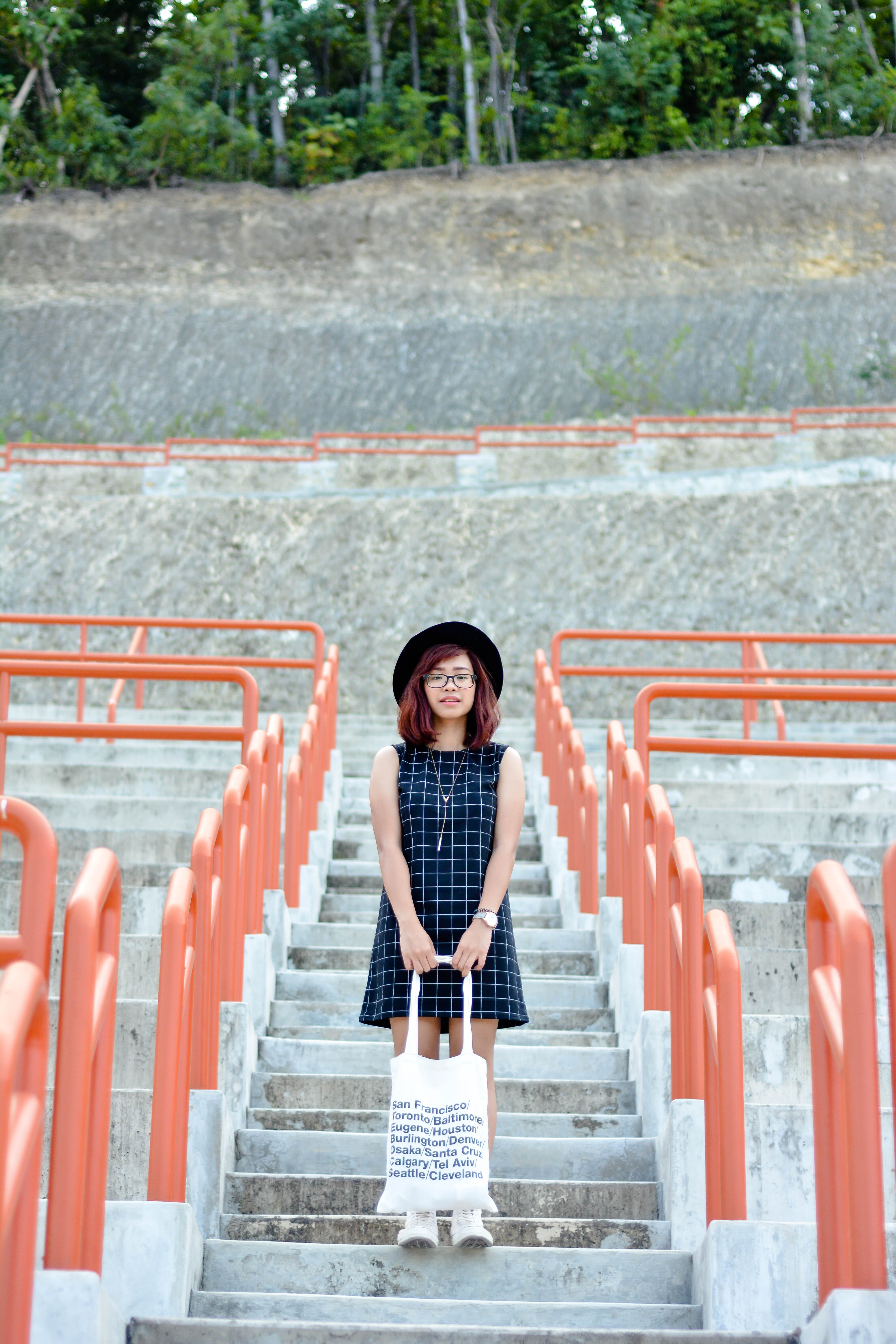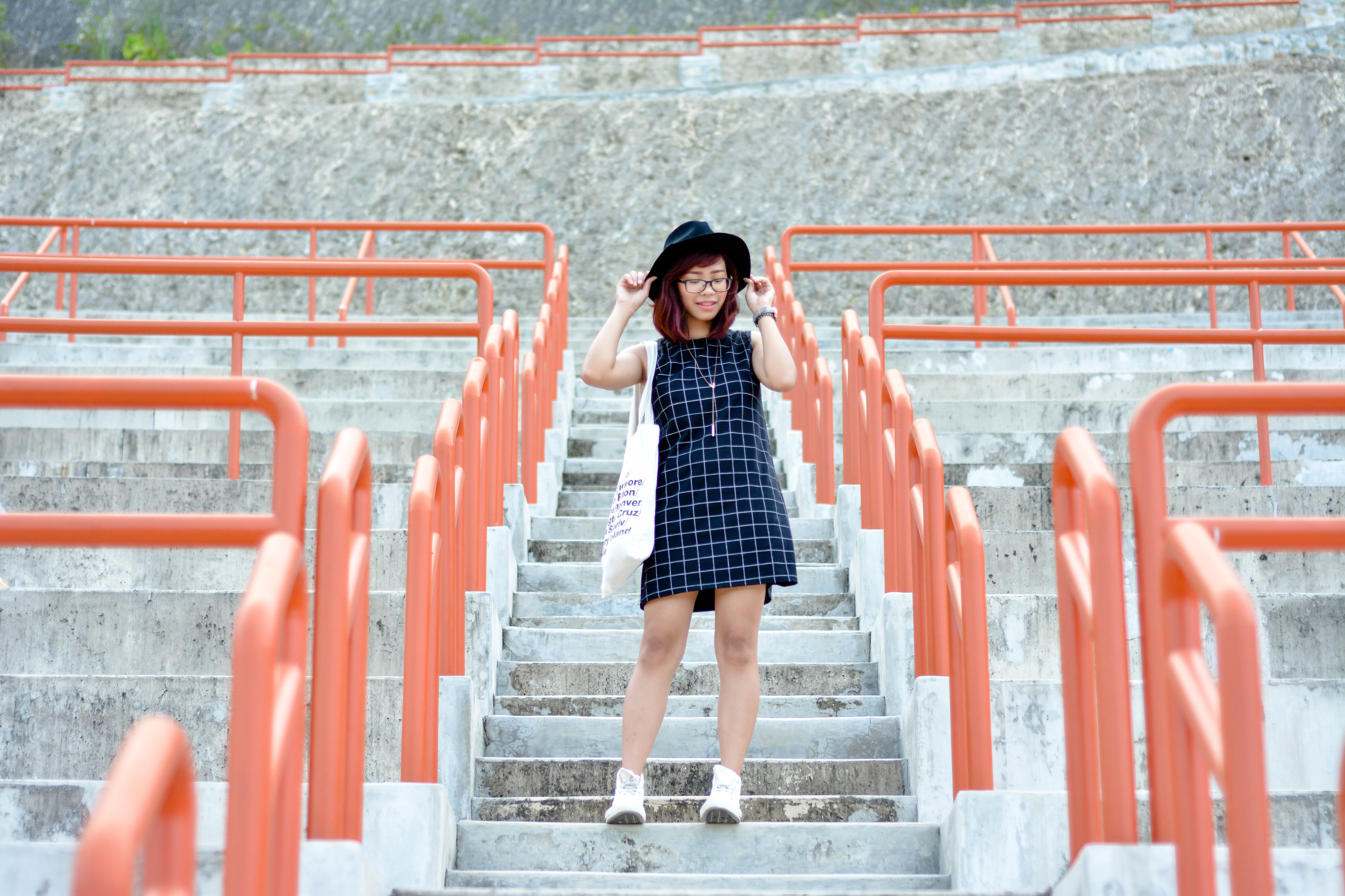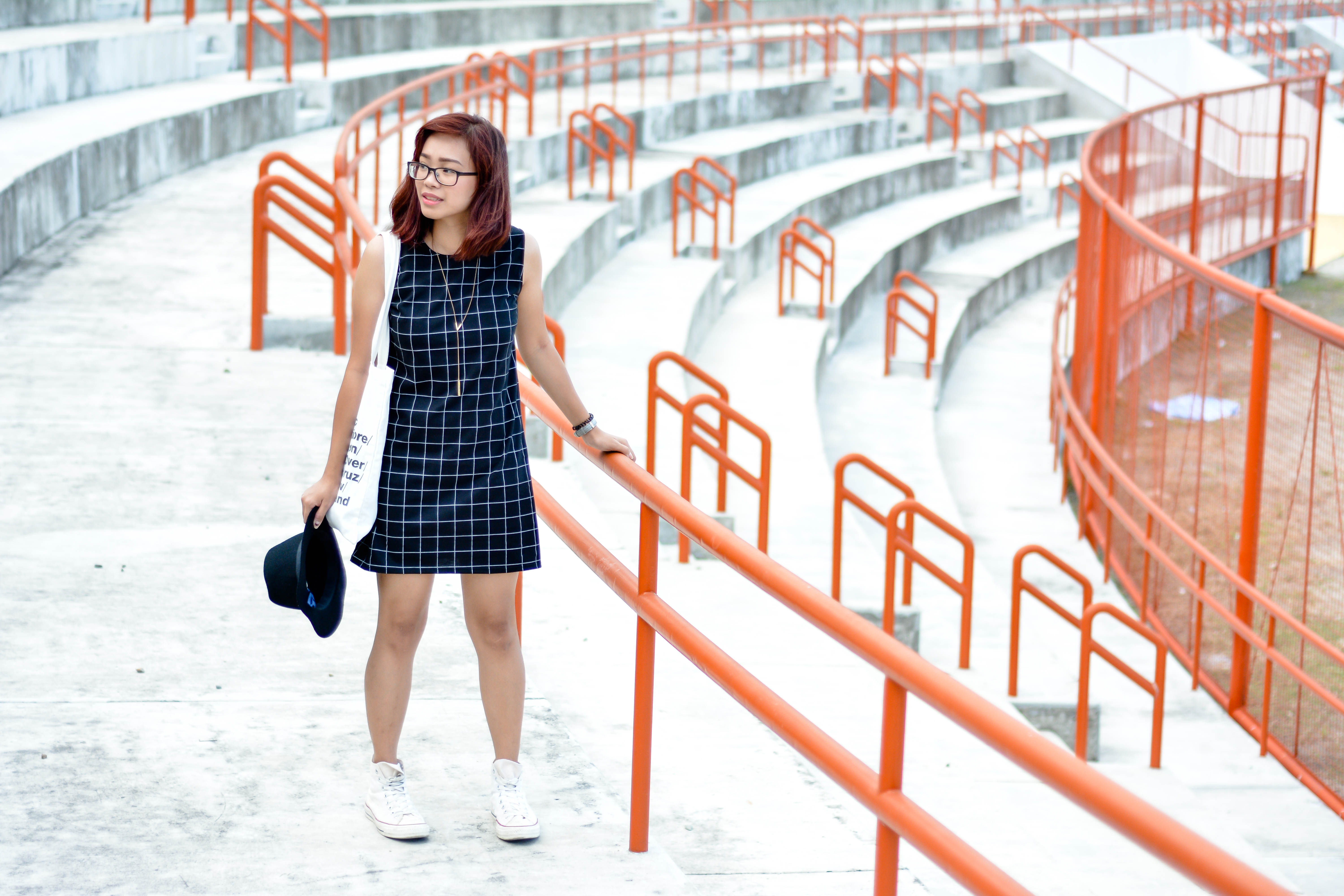 As for this outfit, I added a black fedora hat, a dainty long necklace, a pair of high cut chuck taylors and a simple tote bag to finish off my look. So Basic! I also love how my outfit pops out from those red railings! What do you think?