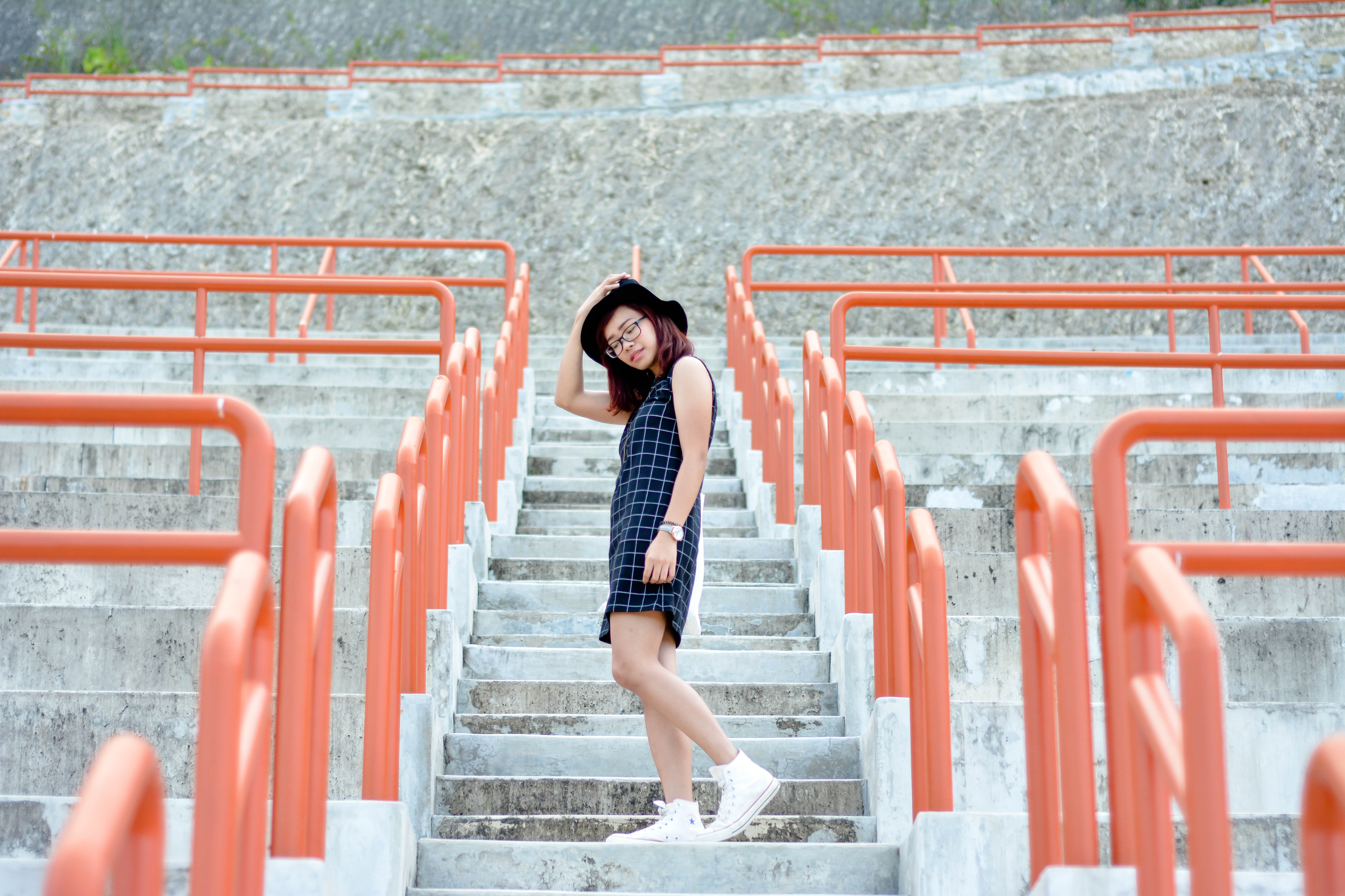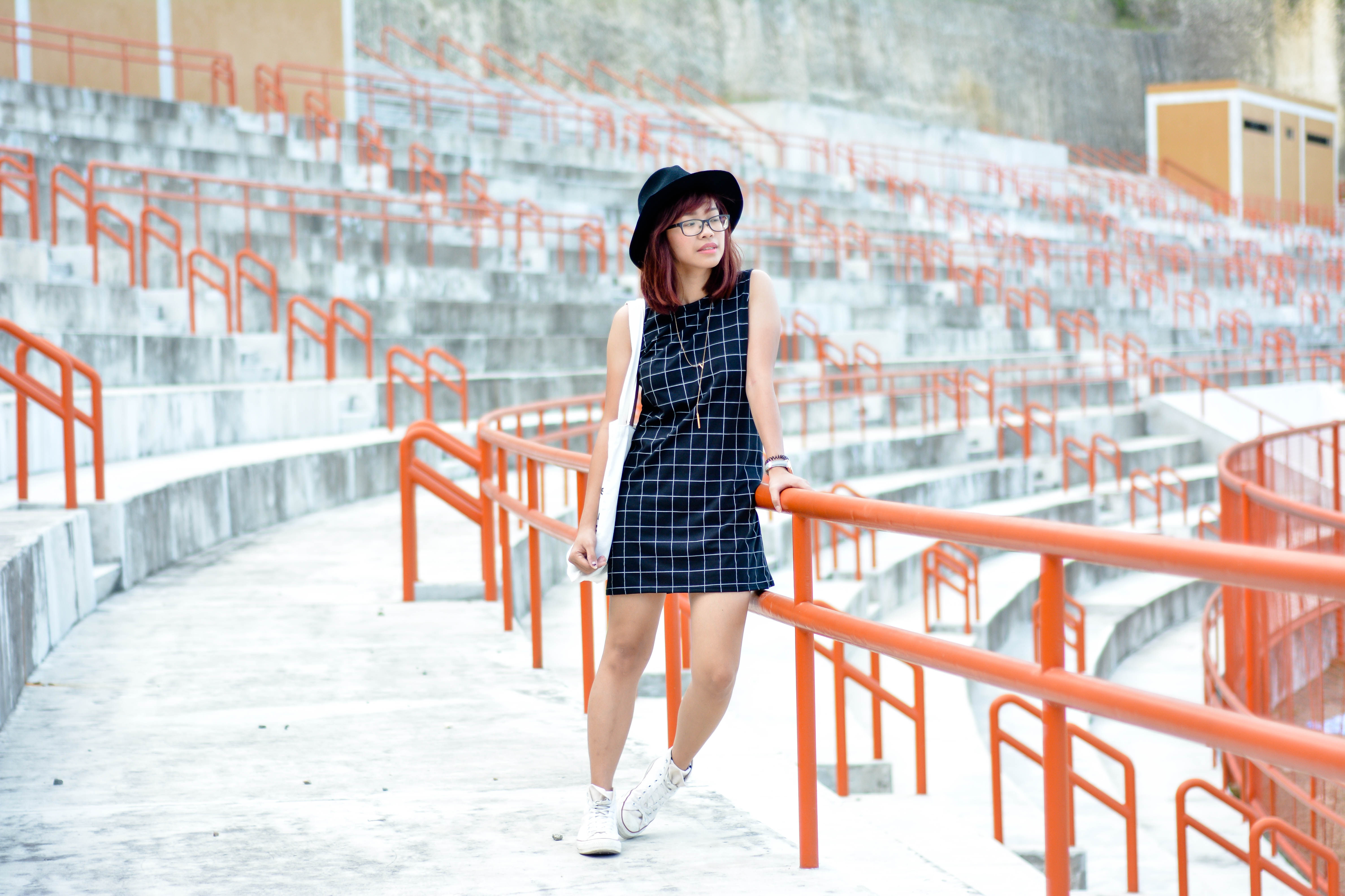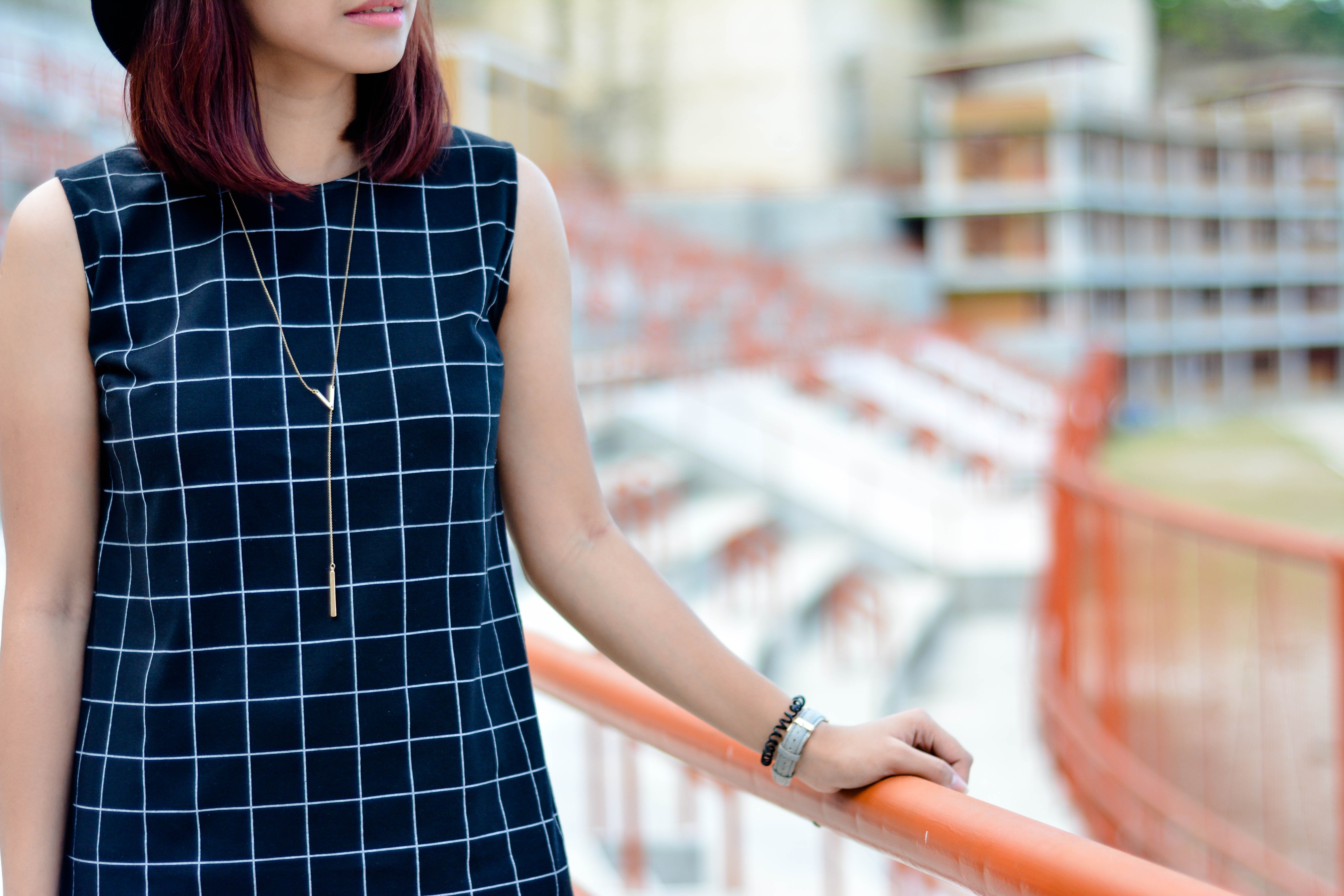 As for this outfit, I added a black fedora hat, a dainty long necklace, a pair of high cut chuck taylors and a simple tote bag to finish off my look. So Basic! I also love how my outfit pops out from those red railings! What do you think?