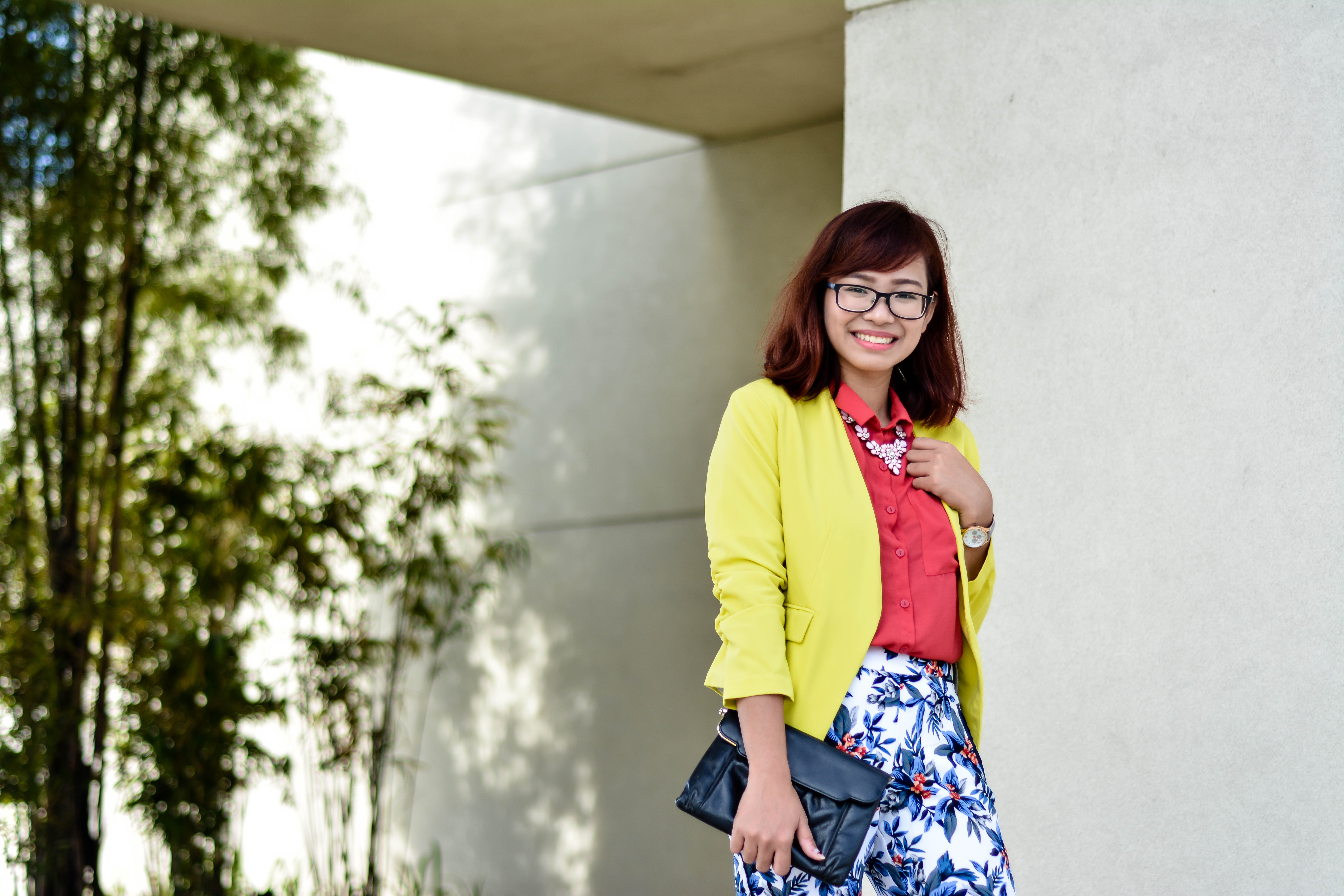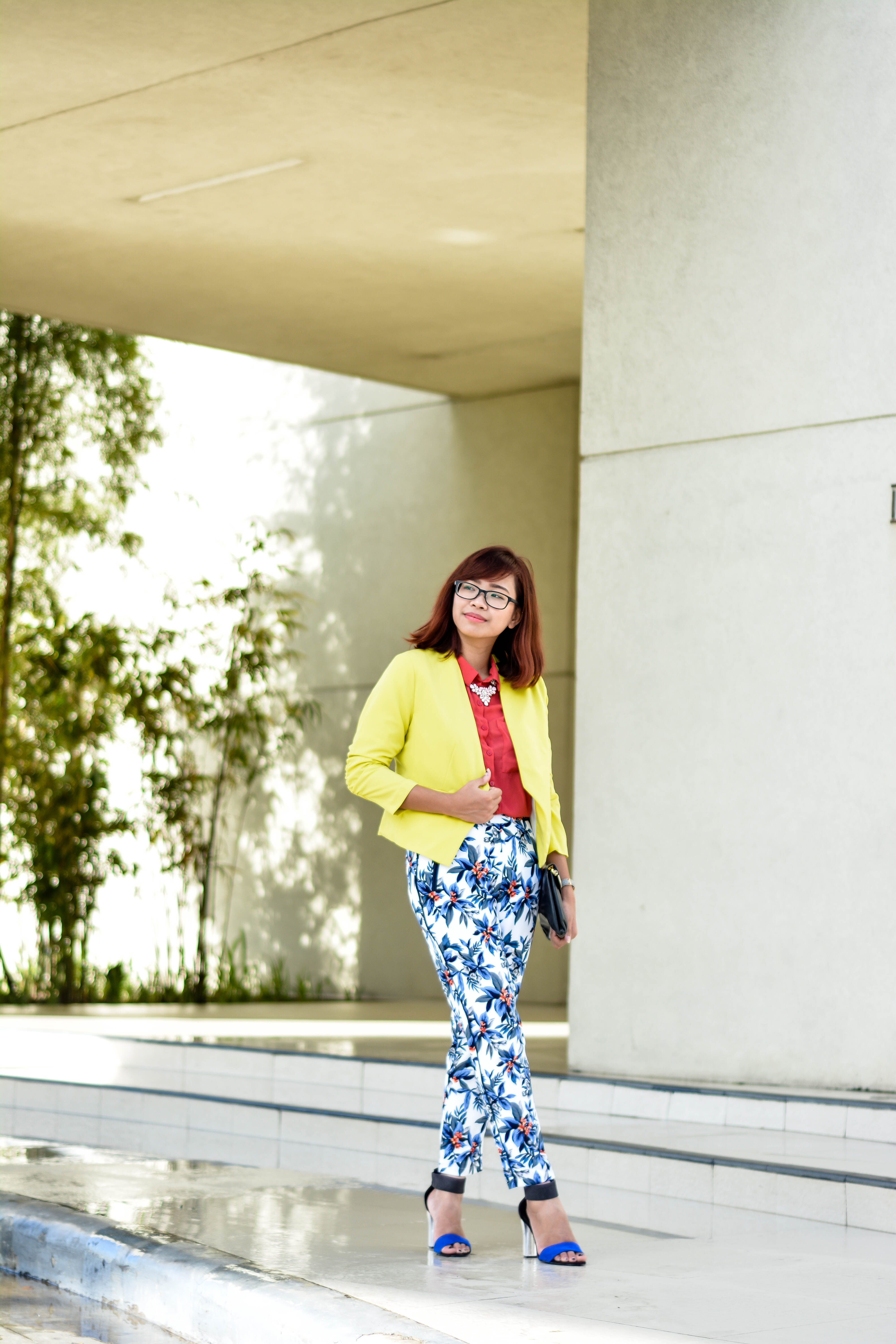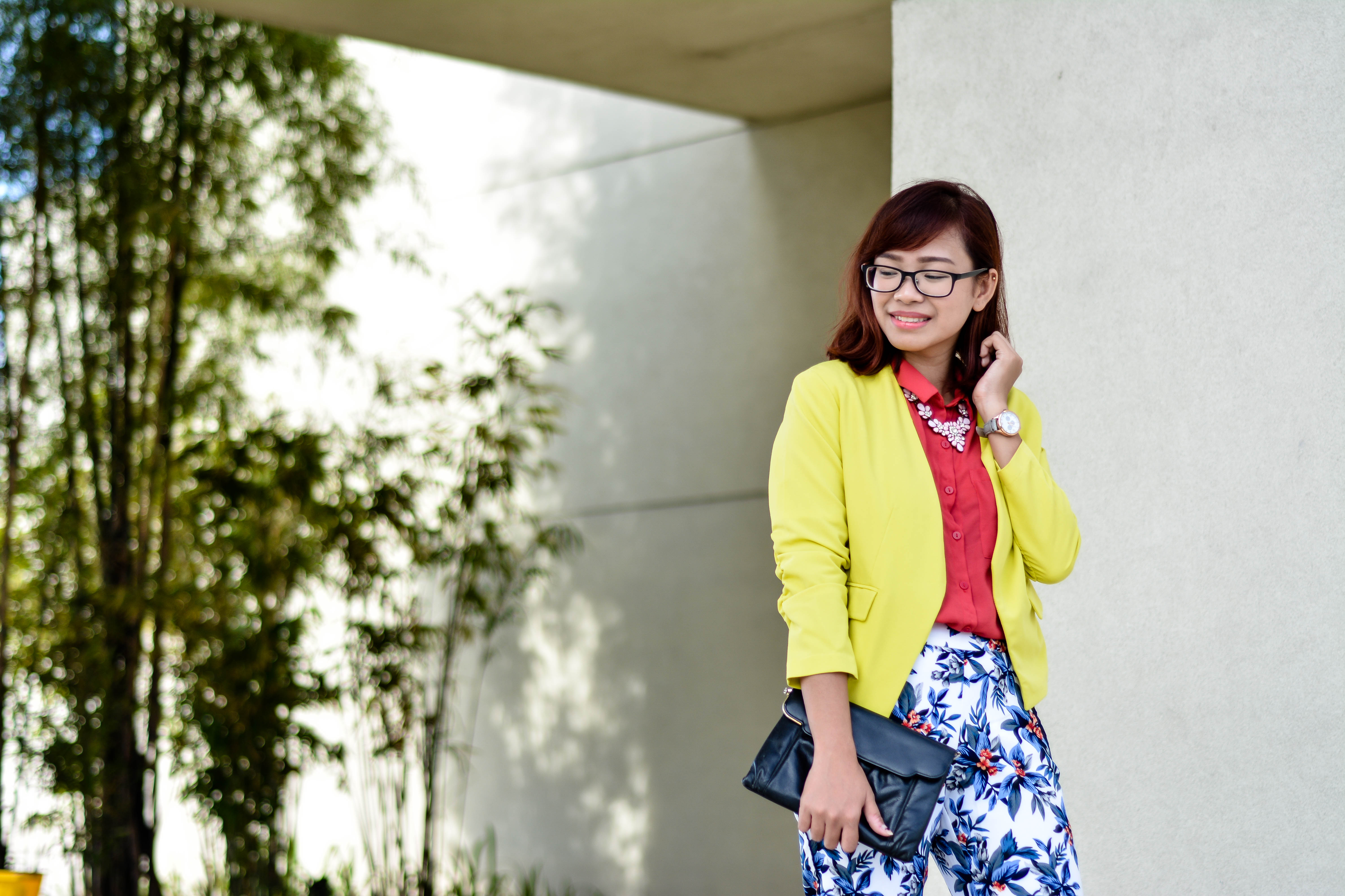 I applied color blocking on the top part of this outfit. Red orange to compliment the little red showing in my pants and yellow blazer to add a bit of contrast on my top.